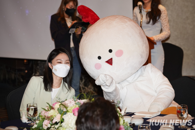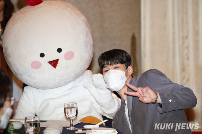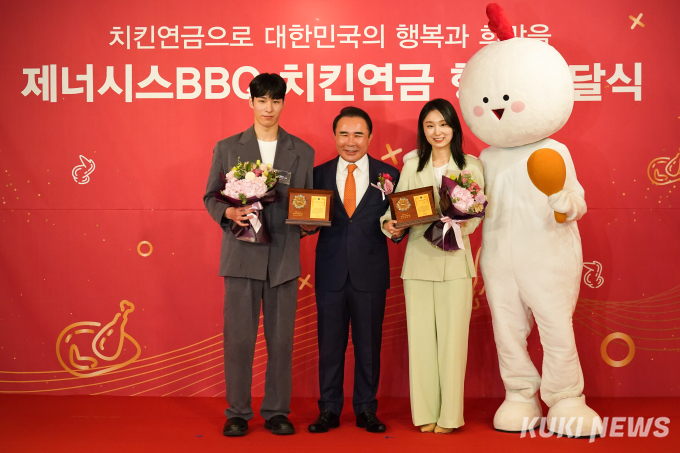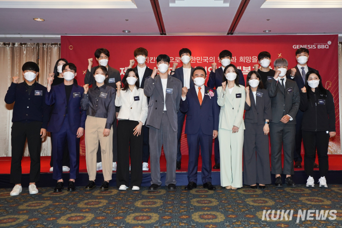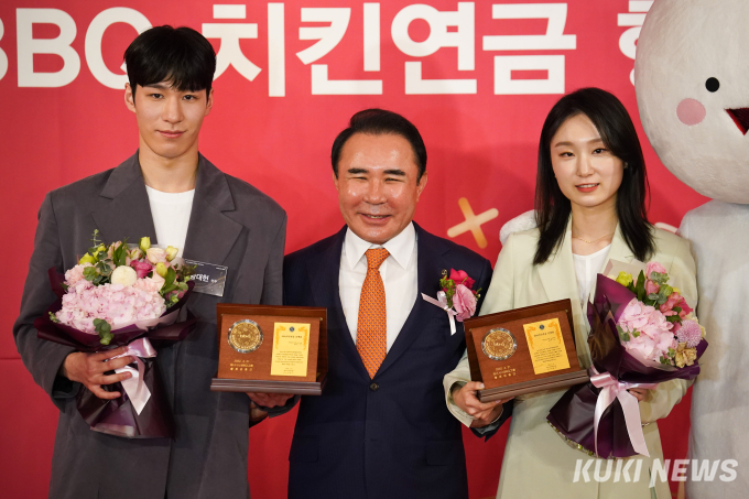 동메달리스트인 김민석, 이승훈 선수는 주2회 10년간 치킨연금을 받게 됐고 빙상종목을 제외한 동계올림픽 5개 종목 각 협회에서 추천한 1명씩 5명의 국가대표 선수는 격려상으로 2주 2회 1년간 치킨을 무료로 먹을 수 있게 됐다. 21일 서울 중구 롯데호텔 서울 사파이어볼륨에서 열린 BBQ 치킨연금 행복 전달식에서 (왼쪽부터) 황대헌 쇼트트랙선수, 윤홍근 제너시스BBQ 회장, 최민정 쇼트트랙선수가 기념촬영을 하고 있다. 임형택 기자 taek2@kukinews.com