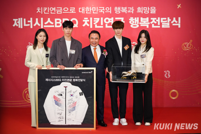 '치킨연금으로 만들어진 대한민국의 희망과 행복'을 모토로 내세운 이번 행사는 윤홍근 BBQ 회장이 베이징동계올림픽에 출전해 국민에게 희망과 기쁨을 선사한 황대헌, 최민정 등 국가대표 선수들에게 평생 치킨 제공하기로 한 약속을 이행하기 위해 마련됐다. 21일 서울 중구 롯데호텔 서울 사파이어볼륨에서 열린 BBQ 치킨연금 행복 전달식에서 윤홍근 제너시스BBQ 회장에게 사인 유니폼과 김아랑 선수의 스케이트화를 선물한 뒤 기념촬영을 하고 있다. 왼쪽부터 최민정,황대헌,윤홍근 회장, 이준서,이유빈.