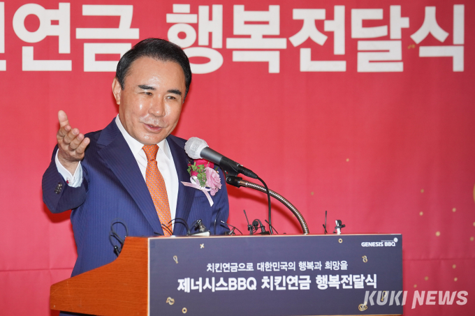 BBQ는 이번 '치킨연금' 지급 기준에 대해 "황대헌, 최민정 선수에게 만 60세까지 연금 형식으로 자사 앱에서 향후 치킨 판매가격과 물가상승률을 고려해 배달비를 포함해 단품 기준으로 먹을 수 있도록 매일 3만원 상당의 딹 멤버십 포인트를 지급한다"라고 밝혔다. 윤홍근 제너시스BBQ 회장이 21일 서울 중구 롯데호텔 서울 사파이어볼륨에서 열린 BBQ 치킨연금 행복 전달식에서 환영사를 하고 있다.