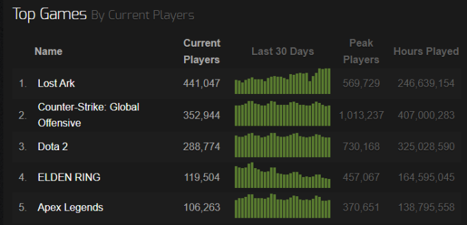 28일 오전 11시 기준, 스팀 최고 동시접속자 56만9729명을 기록하며 동시간대 1위를 유지했다. 불법 프로그램 ‘봇’ 계정과 더불어 현지 서비스사인 아마존의 미숙한 운영 등 부정 이슈로 동시접속자수가 한 때 30만 명대로 떨어지기도 했으나, 지난 21일 콘텐츠 업데이트 후 반등에 성공한 모양새다. 로스트아크는 해당 업데이트에서 신규 클래스인 창술사를 비롯해 베른 남부 지역과 카오스 던전, 필드 보스 등을 추가했다.
