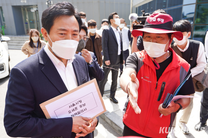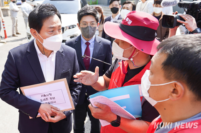 오세훈 서울시장이 6.1지방선거 및 국회의원 보궐선거 후보자 등록이 시작된 12일 오전 서울 종로구 서울시선거관리위원회를 방문해 서류 접수를 마친 후 생존권 보장 촉구 집회를 하는 서울혁신파크 노동자들을 만나 대화하고 있다.