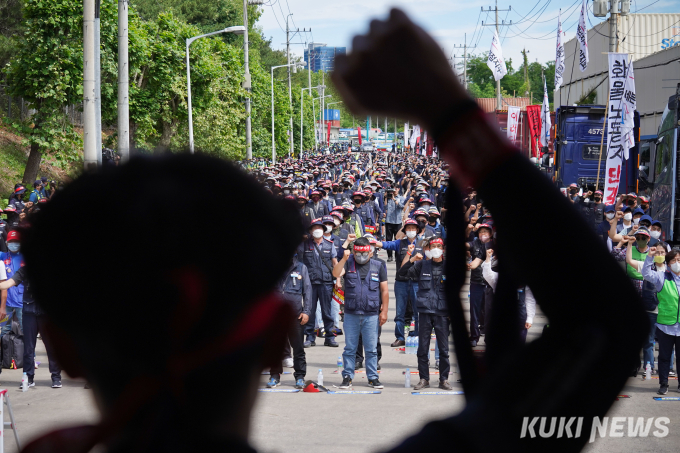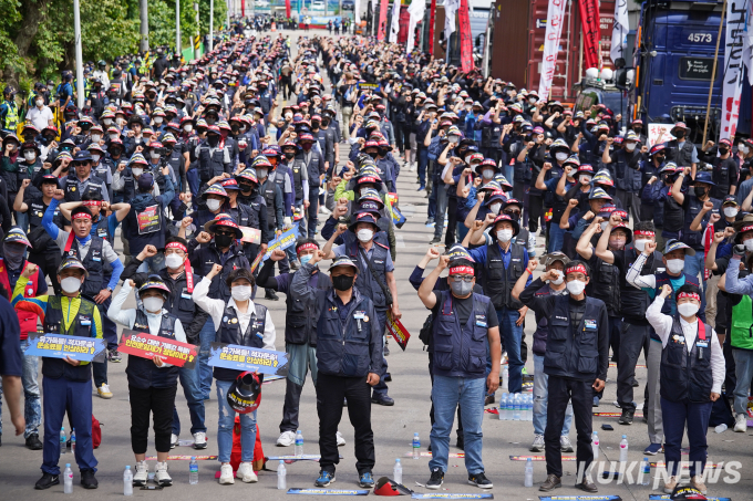 민주노총 공공운수노조 화물연대가 전면·무기한 총파업에 돌입한 7일 오전 경기 의왕시 의왕ICD제1터미널 앞에서 열린 '화물연대 16개 지역본부 동시다발 총파업 출정식'에서 서울경기지부 조합원들이 구호를 외치고 있다.