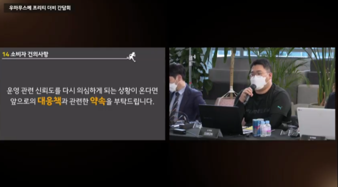 간담회 말미 소송 총대를 맡고 있는 사이먼(닉네임) 유저는 “가장 큰 문제가 된 키타산 블랙픽업 논란과 실질적으로 금전적 피해를 본 부분은 해결이 되지 않은 것 같다”고 지적했다. 이어 “이전에 계정을 삭제했거나, 이번 사태로 피해를 입은 이용자 가운데 환불을 원하는 요구가 있다면 이를 수용할 것이냐”고 질문했다.