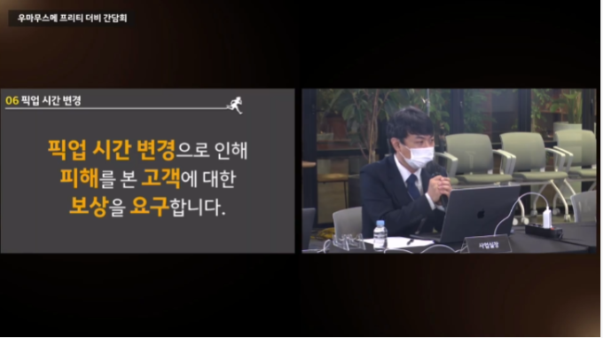 이 본부장은 “그동안 간담회를 준비하면서 많은 것을 배웠다”면서 “오늘 드렸던 약속을 철저하게 이행하고, 앞으로 나아진 모습을 보여드리기 위해 노력하겠다”고 말했다. 그는 “저희의 나아진 모습을 보여드리기 위해 소정의 보상을 준비했다”고 마무리 인사를 전했다.