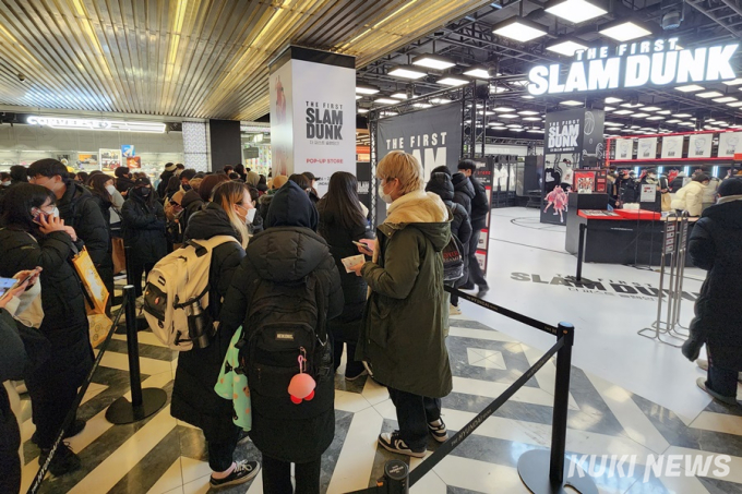 다양한 연령대의 사람들이 각기 다른 목적을 갖고 줄을 섰다. 혼자 온 사람부터 친구들과 함께 추억을 쌓고자 온 사람들, 대신 줄을 서달라는 부탁을 받고 온 이들과 현장을 생중계하는 데 여념 없는 유튜버까지 있다. ‘더 퍼스트 슬램덩크’를 보고 ‘슬램덩크’ 팬이 됐다는 한모씨(24·대학생)은 “친구들과 전날 밤부터 와있었다”면서 “요즘 ‘농놀’(농구놀이의 준말로 ‘슬램덩크’ 팬덤 내에서 영화를 재관람하거나 만화책을 정주행 하는 등 작품을 즐기는 행위를 통용하는 은어) 붐이 와서 정말 즐겁다”며 환하게 웃었다. 오모씨(20대·대학생)는 줄을 서기 위해 전날 기차를 타고 올라왔다. 오후 9시에 줄을 선 그가 받은 대기번호는 180번대. 오모씨는 “현장이 내내 혼잡했다”고 볼멘소리를 하면서도 “하루를 꼬박 투자했지만 후회는 없다”며 미소 지었다.