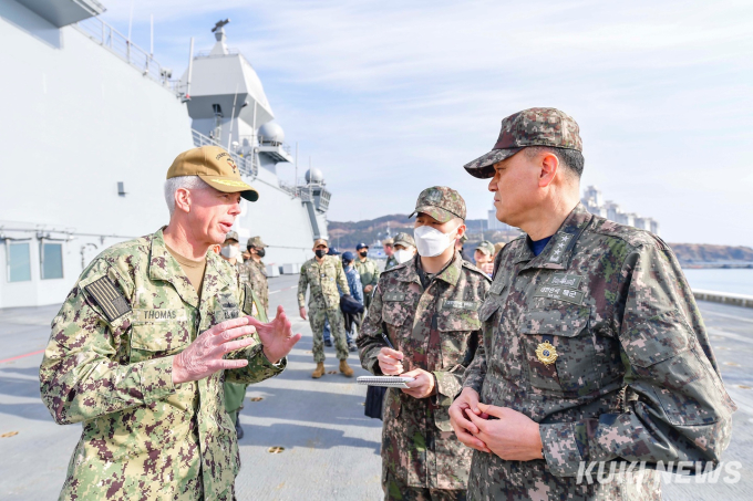 2일 한미 국방장관 회담 직후 김명수 해군작전사령관과 칼 토마스 미7함대사령관이 부산작전기지 내 정박해 있는 마라도함 비행갑판을 걸으며 연합훈련 확대 등 회담 성과 구체화 방안을 논의하고 있다.