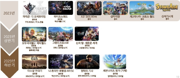 넷마블은 올 1분기 숨고르기에 들어간 뒤, 2분기부터 실적 반등을 노린다. 2분기 모두의마블2: 메타월드, ‘그랜드크로스 W’, ‘신의 탑: 새로운 세계’ 등을 출시한다. 3분기에는 ‘아스달 연대기’, ‘나 혼자만 레벨업: 어라이즈’, ‘원탁의 기사’, ‘세븐나이츠 핑거(가제) 등 4종을 출시할 예정이다. 이밖에 TPS MOBA 장르인 ‘파라곤: 디 오버프라임’과 액션 배틀 게임 ‘하이프스쿼드’를 얼리 액세스(미리 해보기) 이후 연내 정식 출시할 예정이다.