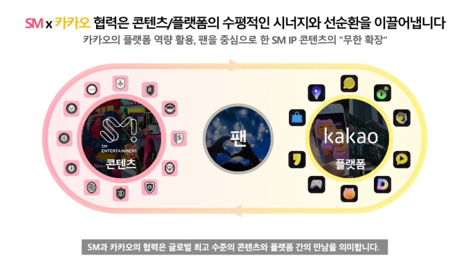 22일 오후 SM 공식 유튜브 채널에는 SM이 주주와 팬 관점에서 카카오와 전략적 협력이 어떤 의미를 갖는지 설명하는 영상이 올라왔다. SM은 카카오와의 제휴를 “콘텐츠와 플랫폼 간에 수평적인 시너지와 선순환을 만드는 상호 전략적 협력 관계”라고 규정했다.