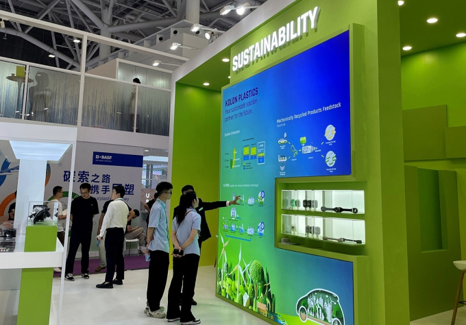 코오롱플라스틱은 ‘지속가능성’ 테마와 엔지니어링플라스틱 제품 4가지 테마(‘PA & PBT’, ‘POM’, ‘TPC-ET’, ‘KompoGTe®, Thermal runaway’)를 키워드로 전시부스를 구성했다.