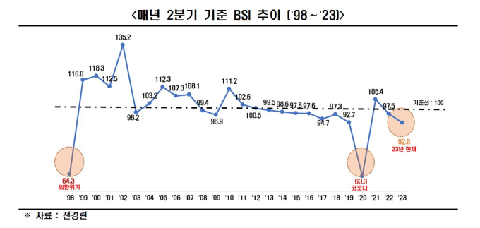 월별 BSI를 매년 2분기 기준으로 전환한 결과, 올해 2분기 BSI 전망치는 92.6로 나타났다. 이는 코로나바이러스감염증-19(코로나19) 초기였던 지난 2020년 2분기(63.3)를 제외할 경우, 외환위기 당시인 지난 1998년 2분기(64.3) 이후 가장 낮은 수치다.