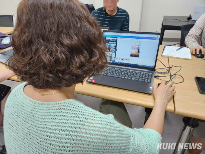 무료 디자인 툴을 활용해 콘텐츠를 제작하는 일도 수강생들에게는 생소했다. 다들 한 단어라도 놓칠세라 노트에 적어가며 수업을 들었다. “어떻게 글자를 붙이면 되죠?”, “복사는 어떻게 할 수 있나요?”, “음악을 카드마다 다르게 넣을 수는 없나요?” 등 질문도 이어졌다. 수강생 오모(53·여)씨가 배경 바꾸기를 어려워하자 함께 강의를 들은 남편 김씨가 옆에서 조언을 시작했다. 오씨는 “어머, 당신이 웬일이야”라며 꺄르르 웃음을 지었다.
