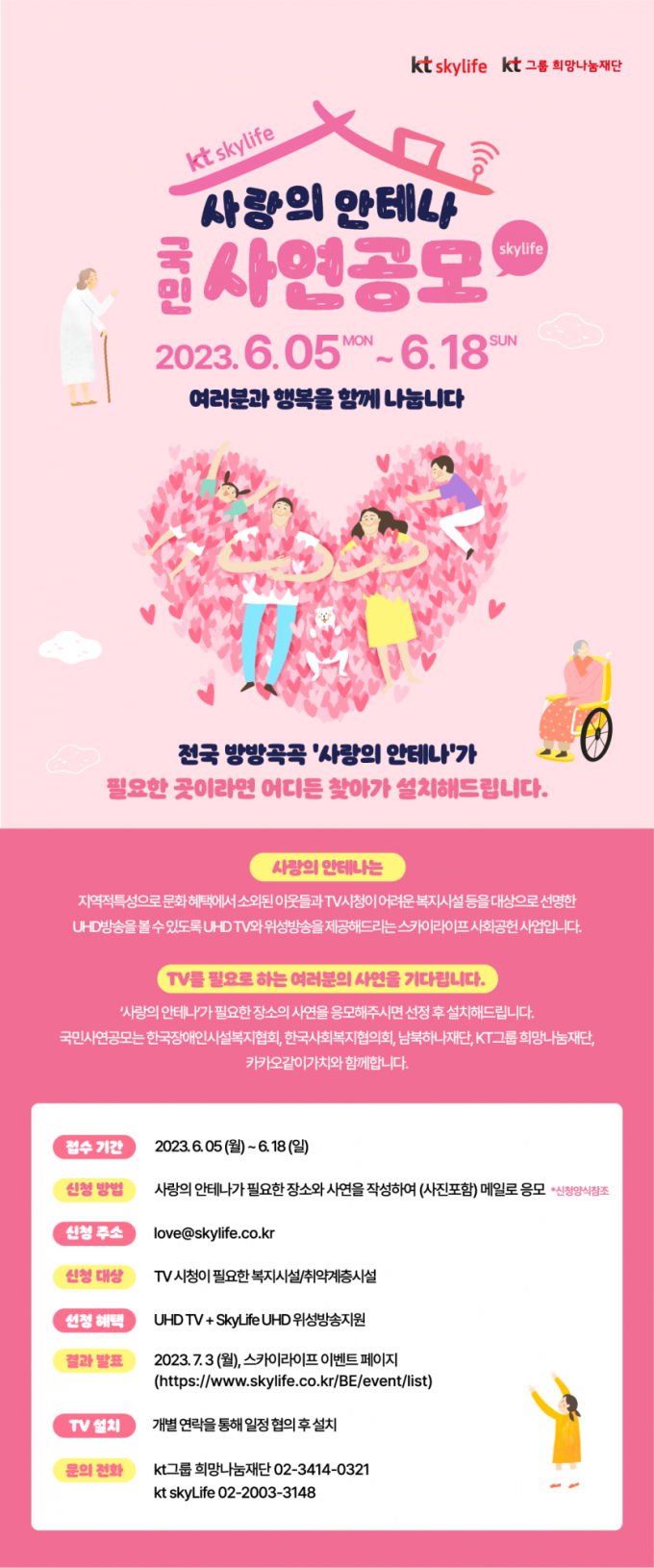 KT스카이라이프가 TV 시청이 필요한 복지지설과 취약계층 시설에 UHD TV와 평생 무료 시청권을 제공하는 ‘사랑의 안테나’ 국민사연공모를 시작한다.
