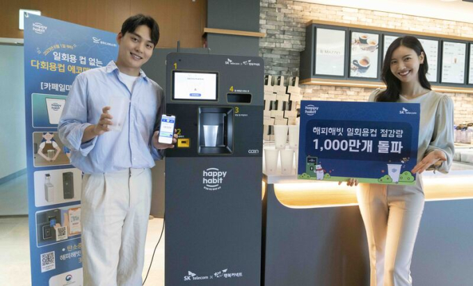 SKT는 20일 ICT 솔루션 기반의 다회용 컵 순환 캠페인 ‘해피해빗’이 일회용 컵 1000만개를 절감하는 성과를 통해 293톤의 탄소배출 저감 효과를 거뒀다고 밝혔다. 해빗에코얼라리언스에서 운영하는 해피해빗은 지난 2020년 시행돼 현재 SKT와 행복커넥트 등 90개 기관이 참여하는 민관 협력 프로젝트다.
