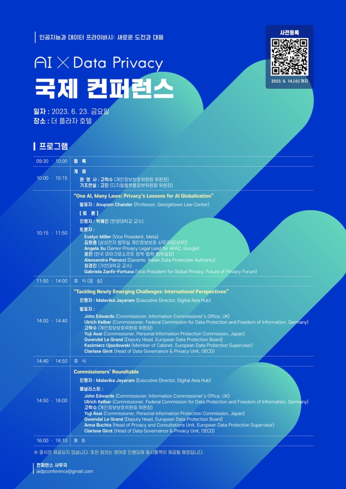 오후 세션은 말라비카 자야람(Malavika Jayaram) 디지털 아시아 허브의 총괄 디렉터가 진행하며 우리나라 개인정보위 외에도 영국·독일·일본의 개인정보 감독기구의 기관장 등 고위인사와 유럽연합 개인정보보호 이사회(EDPB), 유럽연합 개인정보보호 감독기구(EDPS), 경제개발협력기구(OECD) 데이터 보호 조직의 대표자가 참석한다.