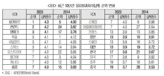 대한상공회의소(대한상의)는 세계은행이 발표한 2023년도 물류성과지수(LPI) 보고서를 분석한 결과, 한국의 물류경쟁력 순위는 17위로 20위권 내로 최초 진입했다고 26일 밝혔다.