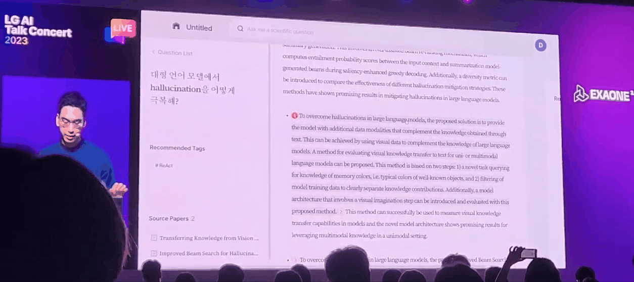 이날 이문태 LG AI 연구원 어드밴스드 ML 랩장은 엑사원 유니버스를 통해 ‘대형 언어모델이 환각현상을 어떻게 극복해야 하는지’ 등을 물었다. 엑사원은 각종 문헌 등을 참고, 답변에 비주얼 등을 함께 제시할 것과 자연어 추론 기법을 제공할 것 등을 제안했다.