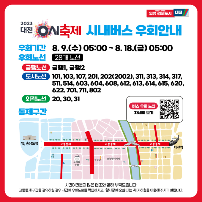 오는 8월 11일 열리는 '‘대전 0시 축제' 기간동안 대전역에서 옛 충남도청 구간 중앙로와 대종로 일부 구간의 차량통행이 전면 통제됨에 따라 행사장을 통과하는 시내버스 28개 노선도 우회 운행된다.
