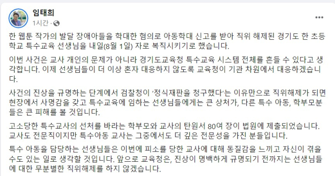 31일 임 교육감은 자신의 사회관계망서비스(SNS) 페이스북을 통해 “웹툰 작가의 발달 장애아들을 학대한 혐의로 아동학대 신고를 받아 직위 해제된 경기도 한 초등학교 특수교육 선생님을 내일(8월10일) 복직시키기로 했다”고 밝혔다.