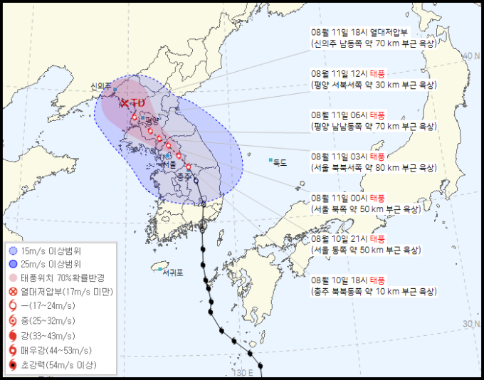다만 우리나라 기상청은 카눈이 11일 서울 북북서쪽을 지나 평양을 거쳐 신의주 인근 육상에서 열대저압부로 변할 것이라고 관측했다. 일본 기상청과 영국 기상청, 유럽 기상청 또한 카눈의 경로를 비슷하게 예측했다.