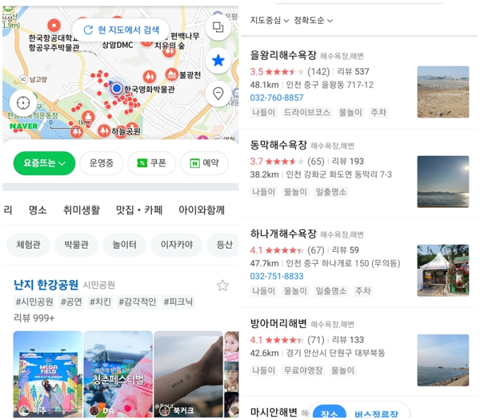 12일 카카오와 네이버는 온라인 지도 서비스에서 각각 물놀이·해수욕장·계곡 또는 가볼 만한 곳 등을 이용자 기반에 맞춰 추천하고 있다. 각각 탭을 누르면 주소와 사진, 리뷰 또는 별점 등을 한눈에 확인할 수 있다. 놀거리, 명소, 취미생활, 아이와 함께 등 세부적으로 장소가 분류돼 있다. 어린이날 등 특정 시기에 맞춰 추천 탭이 달라지기도 한다.