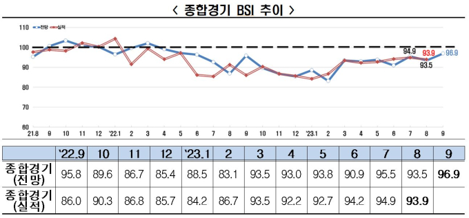 다음 달 업종별 BSI는 제조업과 비제조업이 동시에 부진했다. 제조업 98.9, 비제조업 95.1이다. 제조업은 지난해 4월부터 18개월 연속, 비제조업은 8월부터 2개월 연속 기준선 100을 하회했다.