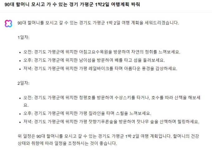 다만 수도권의 범위가 너무 넓었는지 1일차 계획에 오전에는 경기 가평, 오후에는 경기 화성, 저녁에는 경기 파주로 일정을 짜줬다. 2일차는 경기 양주, 평택, 오산 순으로 방문할 것을 권했다. ‘할머니의 건강 상태와 취향에 따라 일정을 조정하는 것이 좋다’는 단서가 붙었지만 90대 할머니를 모시고 가기 쉽지 않은 일정이었다.