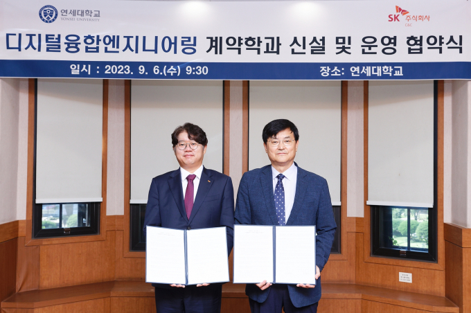SK C&C는 6일 연세대와 ‘디지털융합엔지니어링학과’ 석사 과정 신설 업무협약(MOU)을 체결했다. 이날 서울 서대문구 연세대 본관에서 열린 협약식에는 윤풍영 SK C&C 사장과 서승환 연세대 총장 등 관계자 10여명이 참석했다.