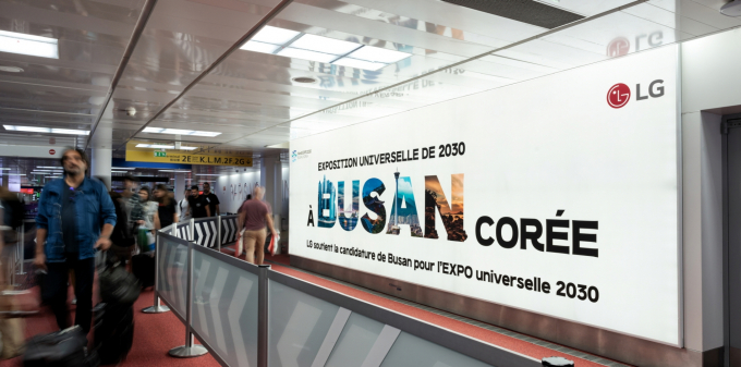 LG는 지난 7일부터 국제박람회기구(BIE) 총회 개최지인 프랑스 파리에서 2030 부산엑스포 유치를 지원하는 광고를 선보였다고 11일 밝혔다. 파리 샤를드골 국제공항 내 6개의 대형 옥외광고판에 응원문구를 넣은 것이다.