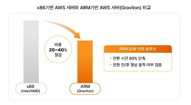11일 SKT는 AWS 기반 클라우드 운영 비용 최적화 솔루션을 출시했다고 밝혔다. 상대적으로 전력 소비가 높은 인텔/AMD기반 서버에서 저전력, 고효율 CPU인 암(ARM) 기반 서버로의 이전을 지원해 운용 비용을 20%에서 최대 40%까지 절감할 수 있다.