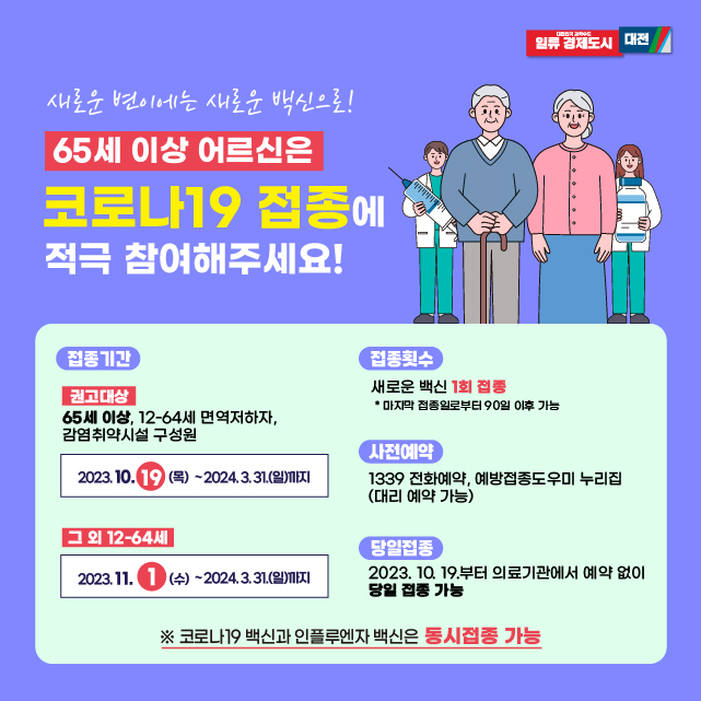 남시덕 대전시 시민체육건강국장은 "인플루엔자와 코로나19의 유행이 염려되는 시기에 코로나19 예방접종은 겨울철 건강을 지키는 가장 효과적인 방법으로 특히 면역력이 떨어지는 65세 이상 어르신은 예방접종을 받을 것을 권장한다"고 밝혔다.