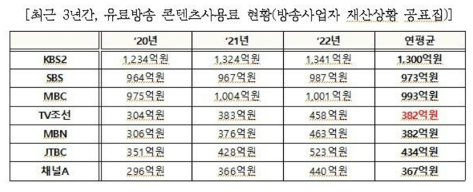 같은 기간 인터넷TV(IPTV)와 케이블TV 등 유료 방송 사업자들이 채널별로 지급한 연평균 콘텐츠 사용료는 KBS 2TV 1300억원, MBC 993억원, SBS 973억원, JTBC 434억원, TV조선· MBN 각각 382억원, 채널A가 367억원이다.