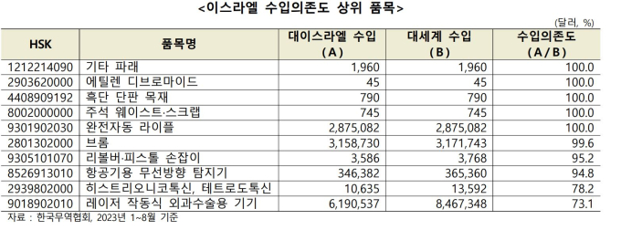 분쟁이 장기화될 경우, 국내 공급망에 문제가 생길 가능성도 있다. 한국무역협회 ‘이스라엘-하마스 분쟁의 국내 경제 영향’ 보고서에 따르면 지난 1~8월 기준 국내 수입품목 중 이스라엘 수입 의존도가 90% 상회하는 품목은 8개다. 이중 비금속 원소인 브롬의 수입 의존도는 99.6%다. 산업용 난연제, 석유 및 가스 시추, 수은배출 방지 등에 사용되는 금속이다. 생산량을 공개하지 않는 미국을 제외하면, 전 세계 브롬의 46.2%를 이스라엘이 생산하고 있다. 드론용 레이더와 GPS 등 항공기용 무선방향 탐지기는 94.8%를 이스라엘에 의존하고 있다.