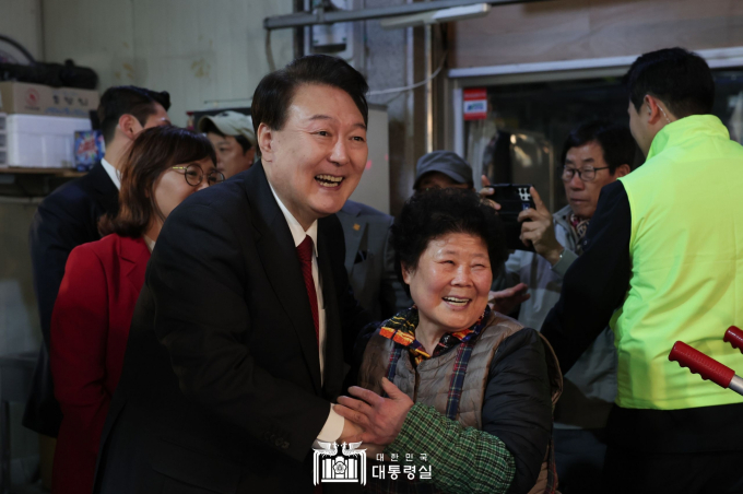 대통령은 시장 점포를 둘러보며 시장 상인에게 안부를 묻고 상인들의 생생한 이야기를 경청했다.