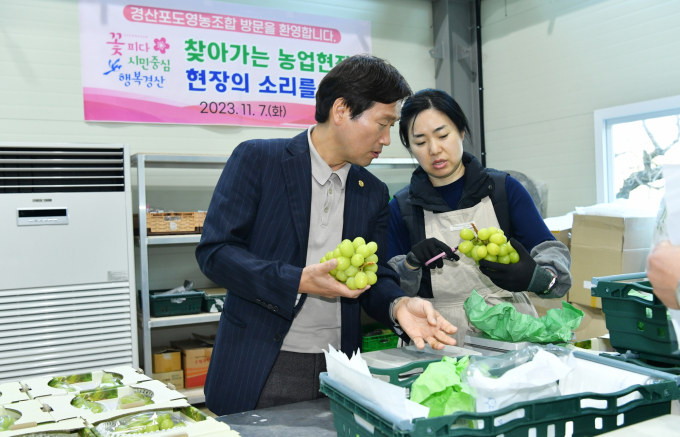 간담회에 앞서 조현일 경산시장은 경산포도영농조합의 선별장에서 직접 선별 작업을 하며 시민들과 소통하고 격려했다.