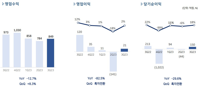 매출은 전분기 대비 8.3% 증가했고, 전년동기 대비 12.7% 감소했다. 영업이익은 매출 증가와 지난 분기 발생한 인센티브 등 일회성 비용이 제거되며 전분기 대비 흑자 전환했고, 전년동기 대비 82.5% 감소했다.