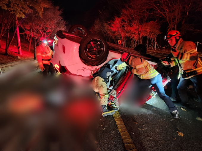 20일 대구소방안전본부 등에 따르면 전날 오후 5시 55분께 동구 신용동 팔공산로에서 승용차가 전복됐다.