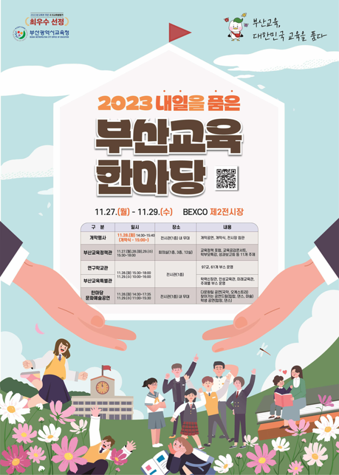 ‘부산교육, 대한민국 교육을 품다’를 슬로건으로 열리는 이번 행사는 올해 부산교육의 성과와 방향을 공유하기 위한 자리로 학생, 학부모, 교사, 시민 등을 대상으로 열린다.