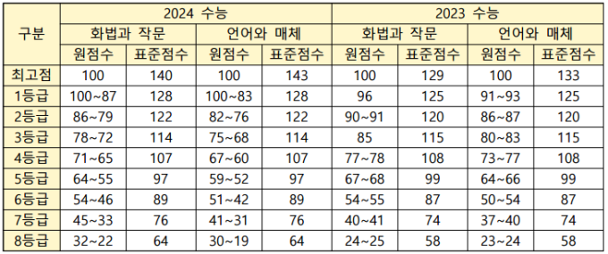 국어영역은 지난해 원점수와 비교하면 화법과 작문, 언어와 매체 모두 9점 정도 하락할 것으로 보인다. 예상 표준점수 최고점은 화법과 작문 140점, 언어와 매체 143점으로 지난해보다 각각 11점, 10점 정도 상승할 것으로 예상된다.