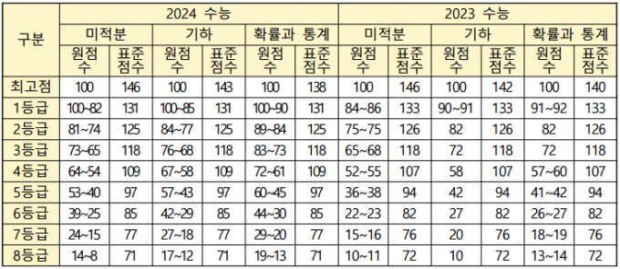 수학영역은 미적분은 비슷하지만, 확률과 통계는 2점 상승, 기하는 3점 하락할 것으로 보이며, 표준점수 최고점도 전반적으로 지난해와 비슷하다.