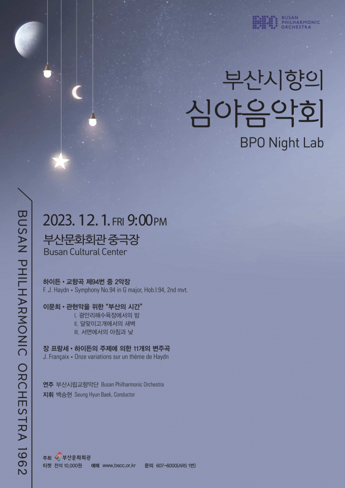 부산시립교향악단 부지휘자 백승현 지휘로 진행되는 이번 연주회는 ‘놀람교향곡’으로 알려진 프란츠 요제프 하이든(1732~1809)의 교향곡 제94번 중 2악장-Andante와 작곡가 이문희(1984~)의 ‘부산의 시간’, 그리고 장 프랑세(1912~1997)의 ‘하이든 주제에 의한 열한 개의 변주곡’ 등 세 곡을 만날 수 있다.