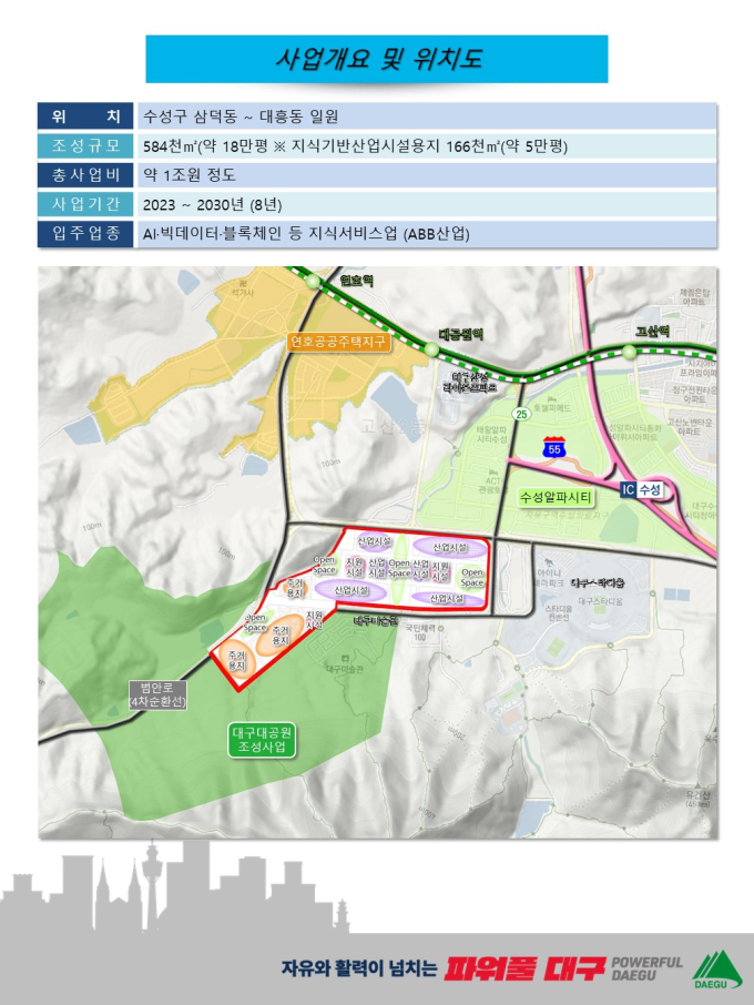 대상지는 수성IC, 범안로에 인접한 우수한 교통 접근성과 대구미술관, 삼성라이온스파크 및 대구스타디움, 그리고 향후 대구대공원 및 연호지구 개발이 예정된 정주 여건이 매우 우수한 지역으로 지역 청년 및 디지털 기업들이 선호하는 직·주·학·유가 가능한 최고의 기업환경을 제공할 예정이다.