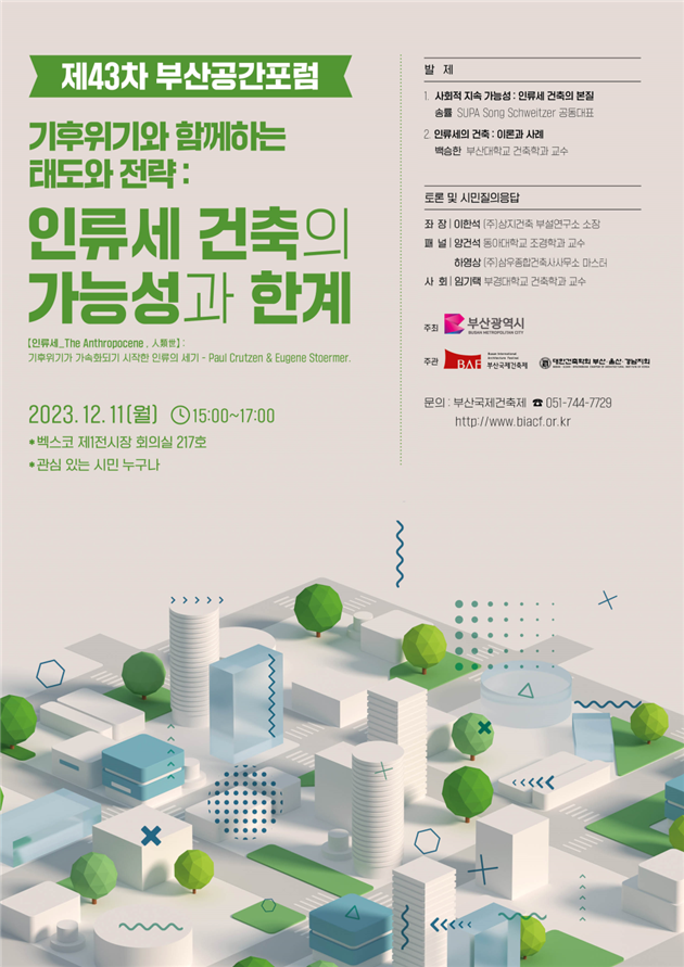 이번 포럼은 ‘기후 위기와 함께하는 태도와 전략 : 인류세 건축의 가능성과 한계’를 주제로 산업계, 학계 등 전문가들이 변화하는 환경에 대응하는 지속 가능한 건축에 대해 발제와 토론을 펼칠 예정이며, 관심 있는 시민이라면 누구나 별도 신청 없이 참석할 수 있다.