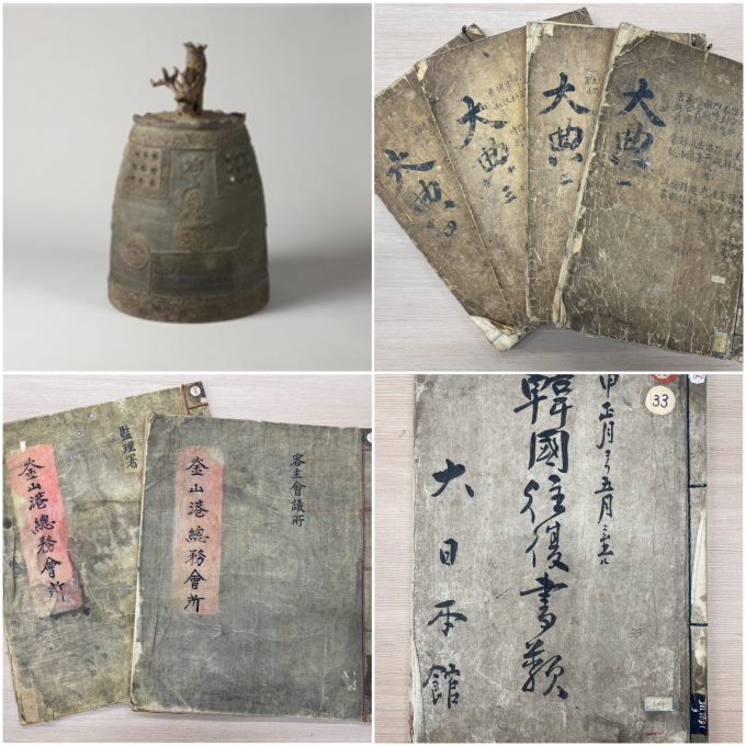 왼쪽 위부터 시계방향으로 ‘상주 안수사명 동종’, ‘경국대전’, ‘한일 외교 관련서’, ‘부산항총무회소’.부산시,부산시교육청