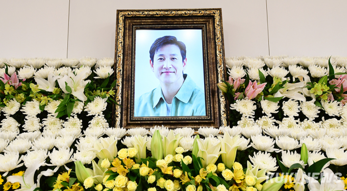 28일 서울 연건동 서울대학교병원 장례식장에 마련된 故 이선균의 빈소에는 사망 당일인 전날부터 연예계 동료를 비롯해 많은 이가 방문해 추모의 뜻을 표하고 있다.