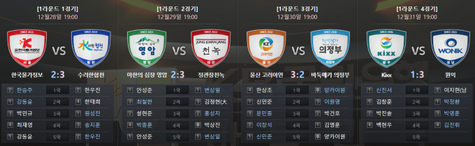 한편 28일 개막전에서 수려한합천을 시작으로 29일 정관장천녹, 30일 울산 고려아연이 각각 한국물가정보와 마한의심장 영암, 바둑메카 의정부를 3대 2로 물리치고 첫승을 신고했다.
