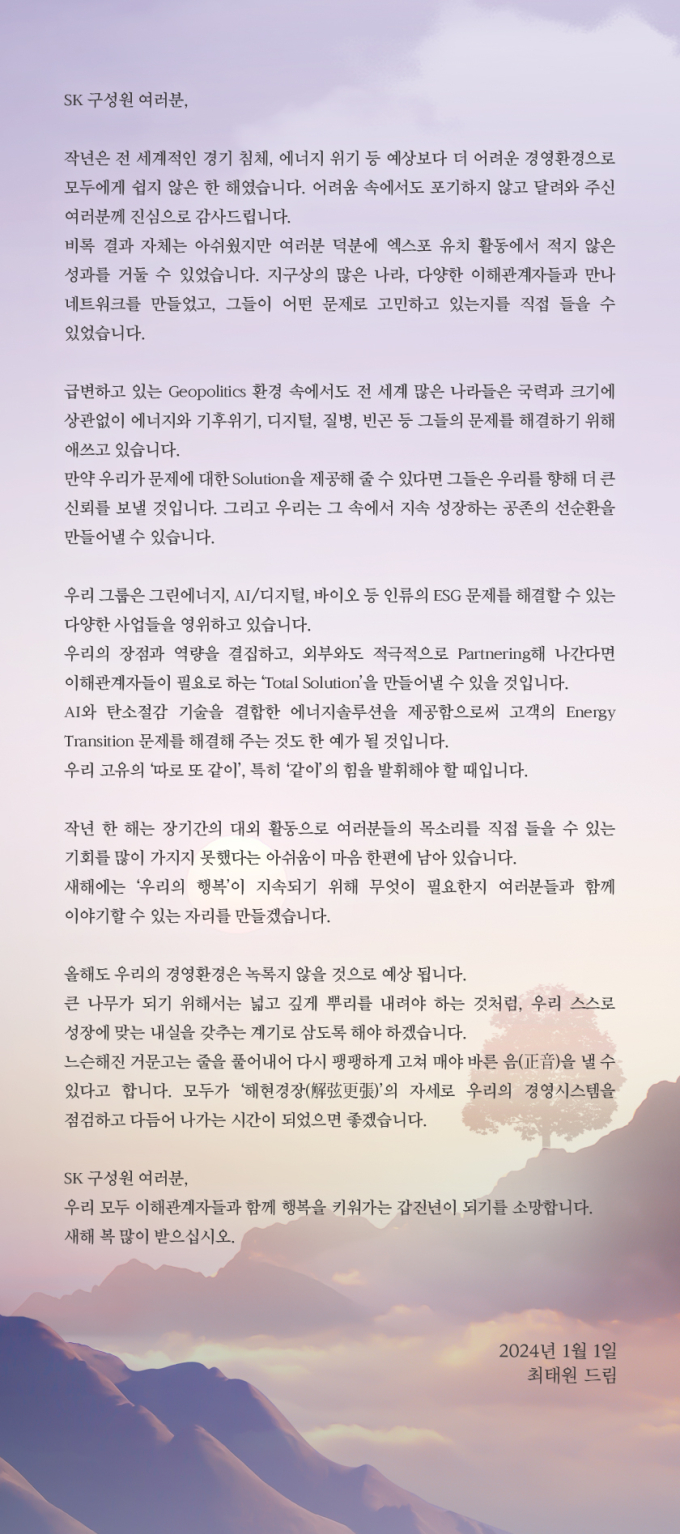 최 회장은 “새해에는 ‘우리의 행복’이 지속되기 위해 무엇이 필요한지 여러분들과 함께 이야기할 수 있는 자리를 만들겠다”며 “SK 구성원들이 모두 이해관계자들과 함께 행복을 키워가는 갑진년(甲辰年)이 되기를 소망한다”고 전했다.