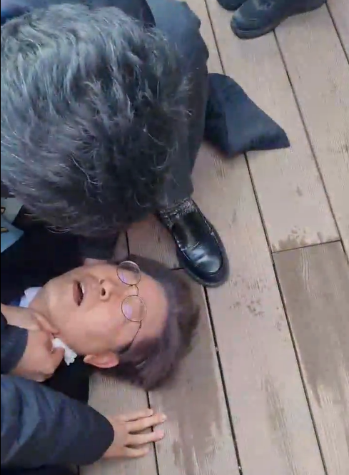 부산 가덕도 신공항 부지에서 괴한에 의해 피습당한 이재명 대표. 독자 제보.