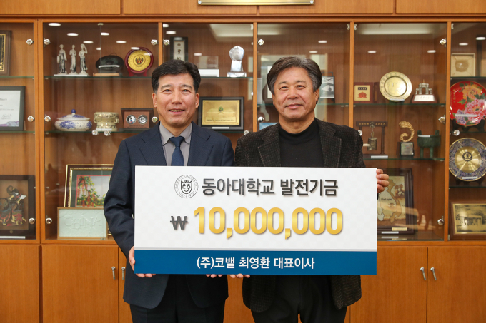 최영환(오른쪽) ㈜코밸 대표이사와 이해우 총장이 발전기금 전달 기념촬영을 하고 있다.동아대학교 최 대표는 “동아대가 밸브 테스트로 유명한데 앞으로 국내는 물론 세계적으로 발돋움하길 바란다”며 “사업을 열심히 키워서 앞으로도 모교에 기부를 많이 할 수 있도록 노력하겠다”고 말했다.