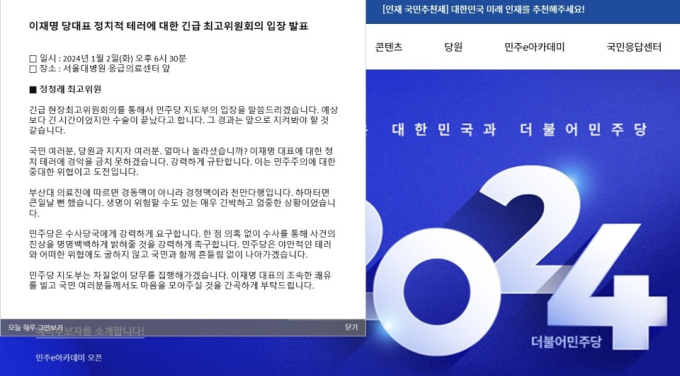 더불어민주당은 홈페이지에 정청래 최고위원 명의로 성명을 내고 이재명 당대표에 대한 사건을 '정치적 테러'로 규정하면서 긴급 최고위원회의 입장문을 게시했다.