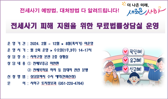 부산 사하구는 전세사기 피해를 예방하고 피해자를 지원하기 위해 올해 2월부터 무료법률 상담서비스를 제공한다.